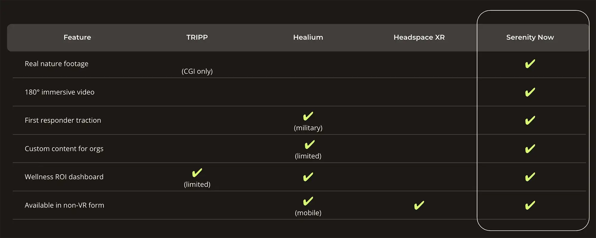We combine evidence-based nature therapy with VR delivery that fits into the rhythm of first responders, healthcare workers, and high-stress teams